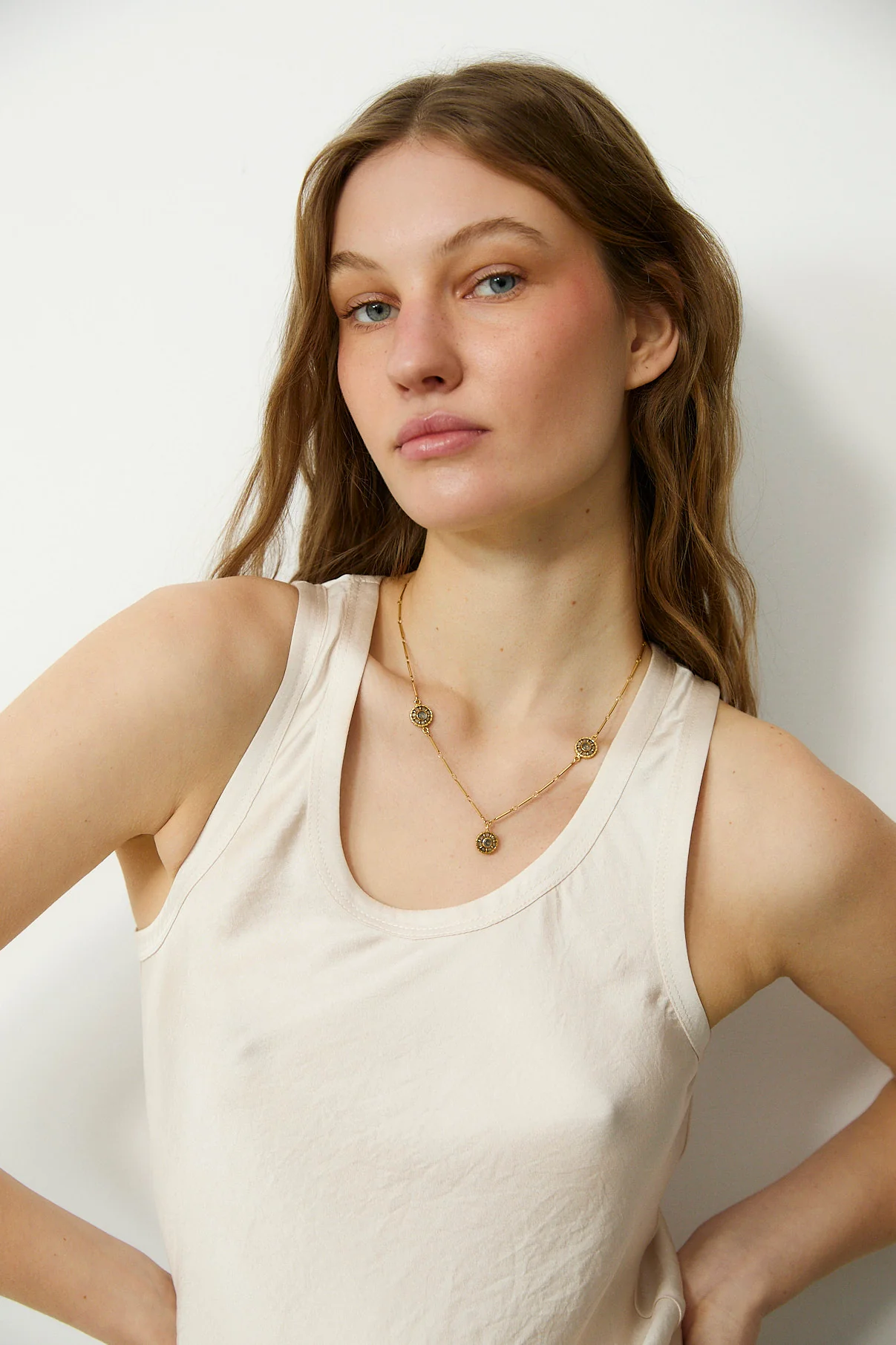 - Relaxed sleeveless silhouette with soft drape