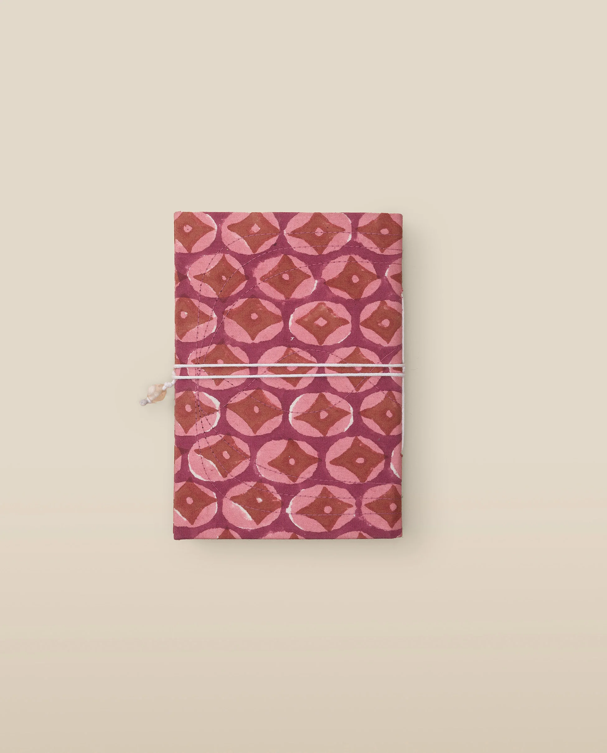 A joyful twist on everyday stationery. Printed with a bold geometric floral motif in shades of pink and rust, this softbound notebook is finished with tonal stitch detailing and a tie closure with glass bead accent. The cover is crafted from recycled, handmade paper, while the inside holds 60 blank pages of smooth bleached 90 GSM paper—perfect for everyday notes, sketches or journaling.