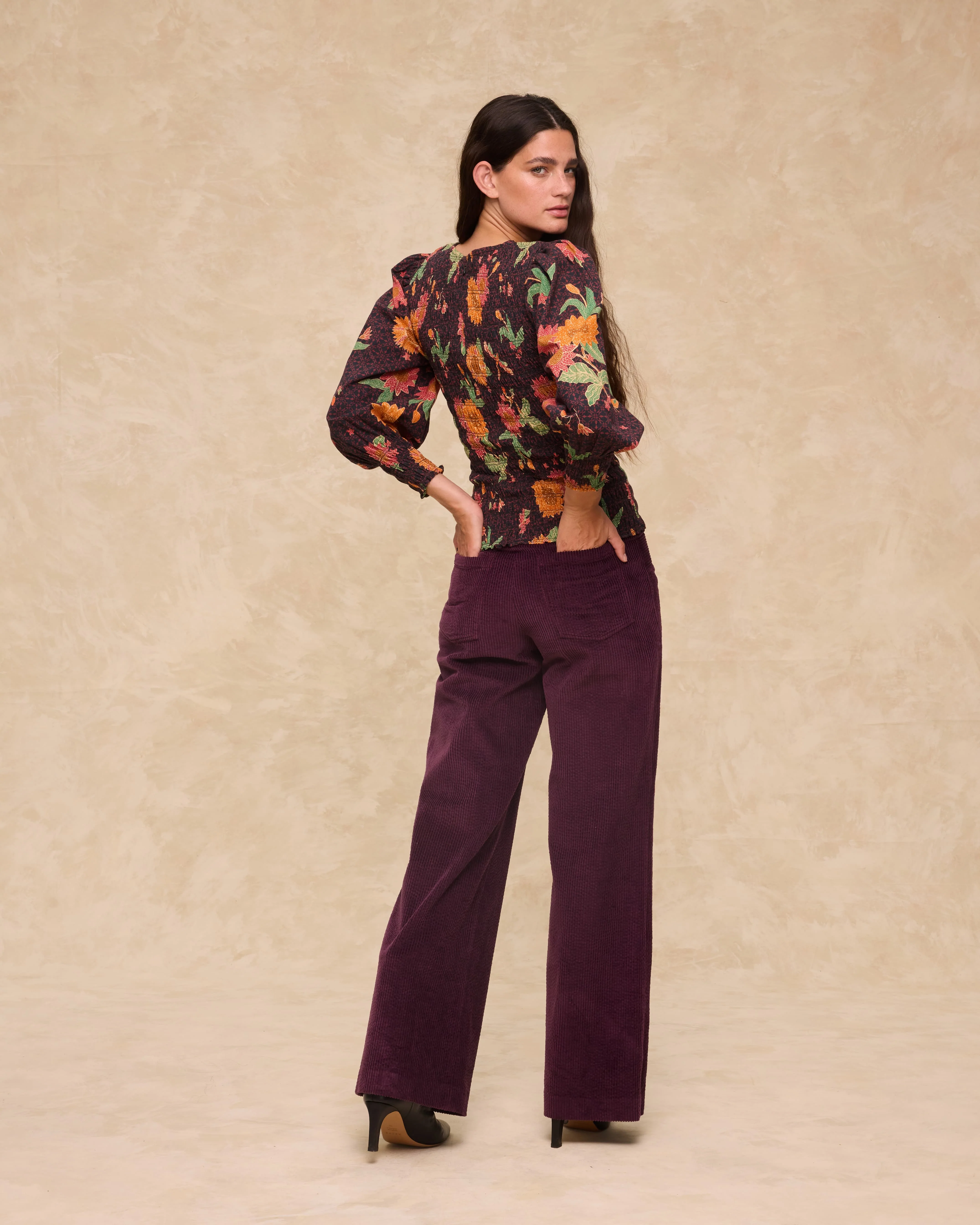 The Scarlet blouse blends a bold botanical motif with softly sculpted volume. Crafted from 100% cotton with a shirred finish, it features a soft round neckline, voluminous sleeves with gathered cuffs and a ruffled peplum hem that enhances the silhouette. A discreet zip at the back ensures a smooth fit.